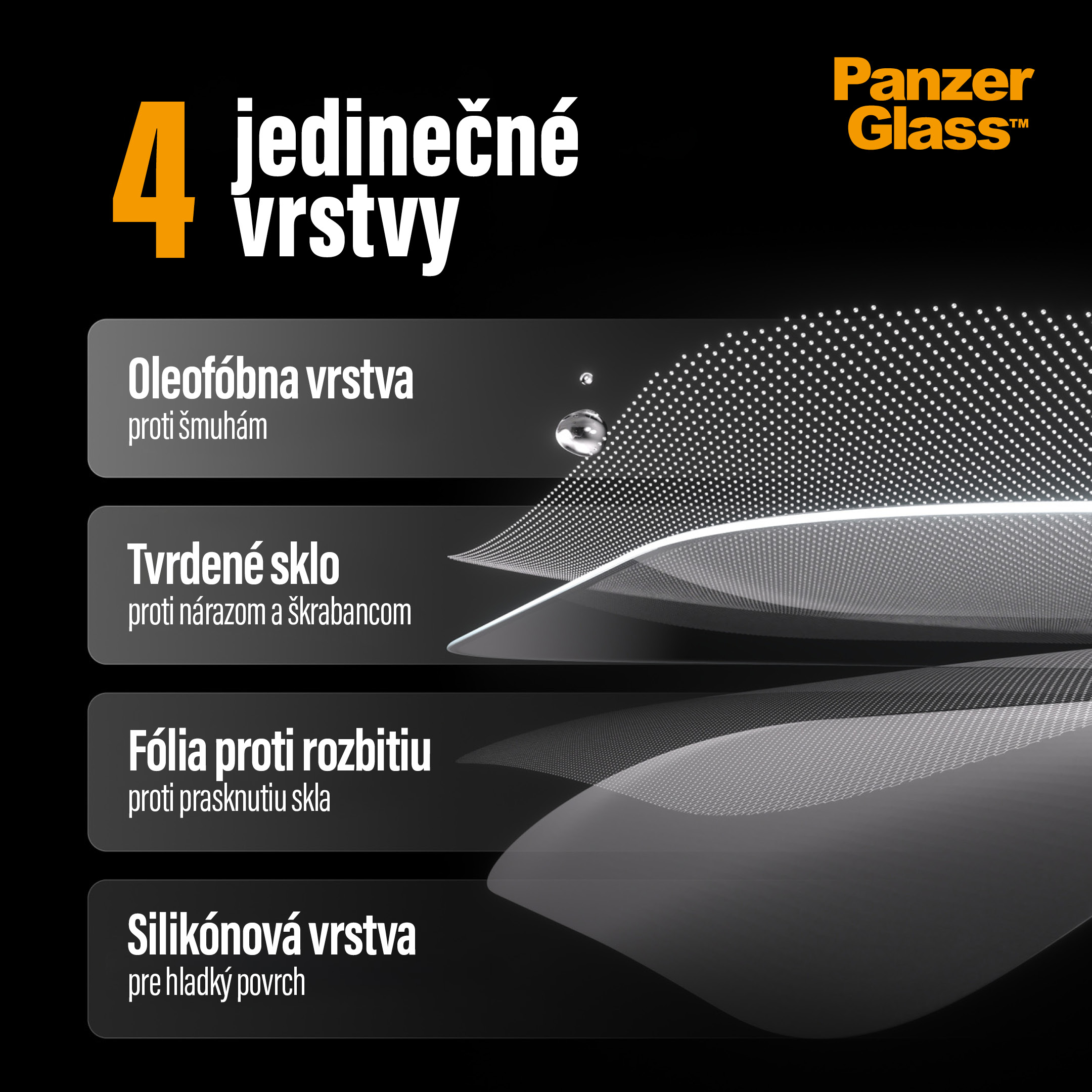 Ochranné sklo PanzerGlass™ Privacy pre iPhone 16 Plus pozostáva zo 4 unikátnych vrstiev: