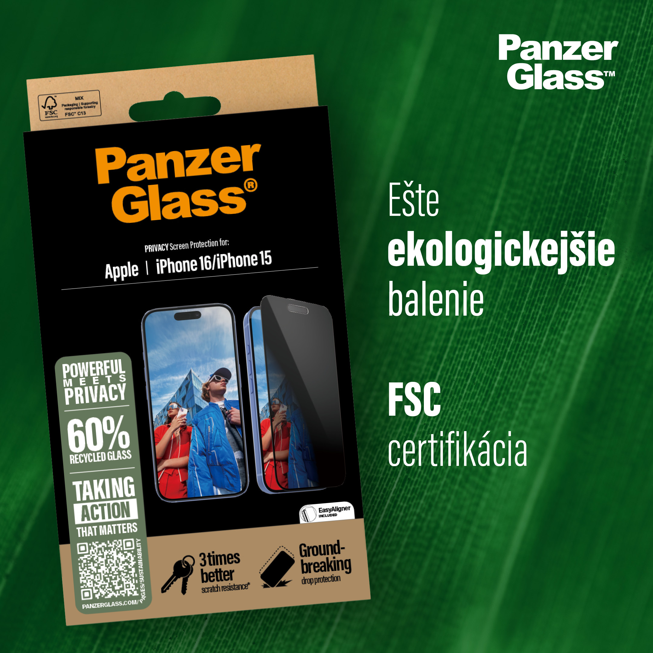 V roku 2024 spoločnosť PanzerGlass™ znížila množstvo papiera používaného na výrobu obalov priemerne o 66 %. A rovnako ako všetky ostatné produkty tohto dánskeho výrobcu, aj sklá pre iPhone 16 Plus sa dodávajú v krabičke vyrobenej z recyklovateľného papiera s certifikátom FSC™.