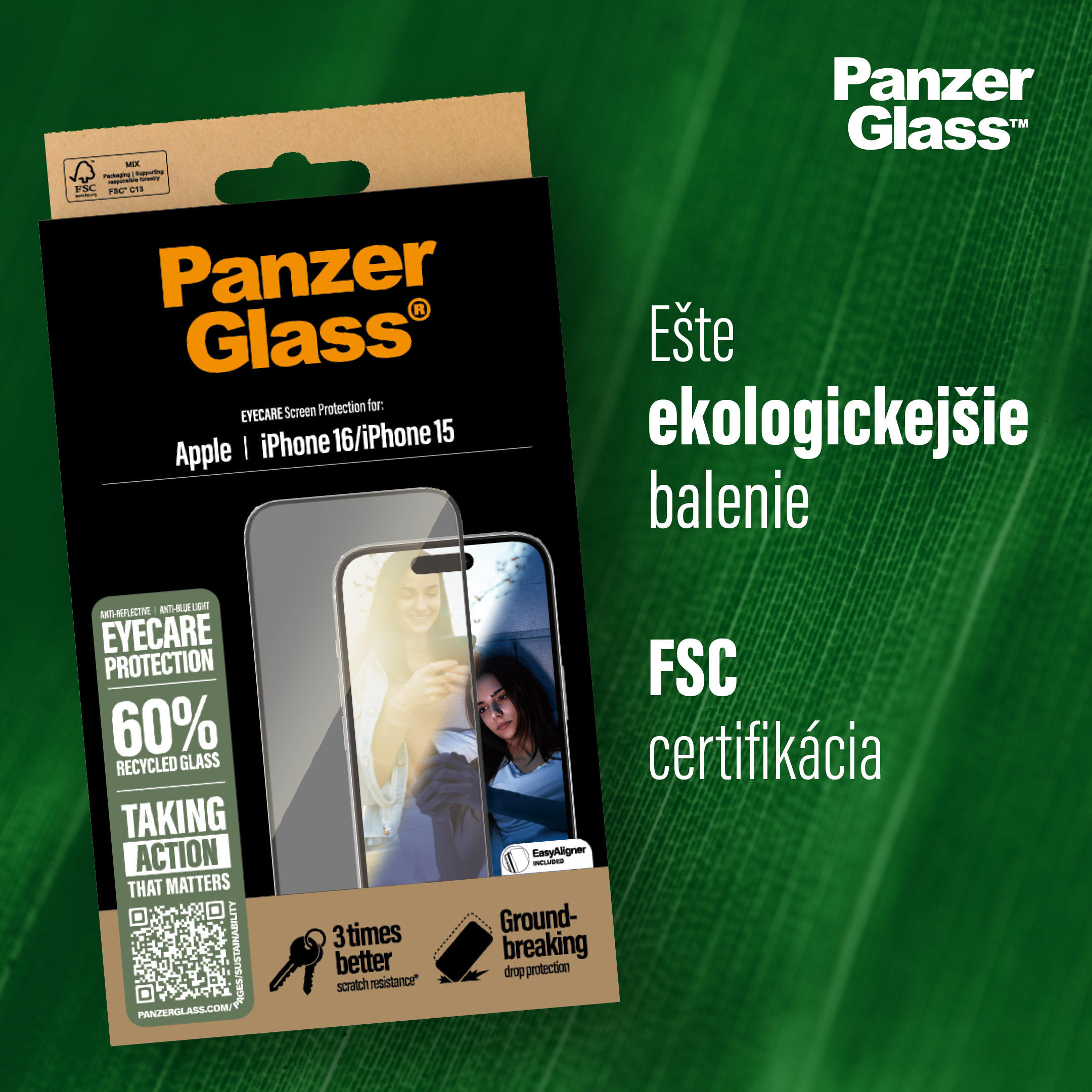 V roku 2024 spoločnosť PanzerGlass™ znížila množstvo papiera používaného na výrobu obalov priemerne o 66 %. A rovnako ako všetky ostatné produkty tohto dánskeho výrobcu, aj sklá pre iPhone 16 Pro sa dodávajú v krabičke vyrobenej z recyklovateľného papiera s certifikátom FSC™.