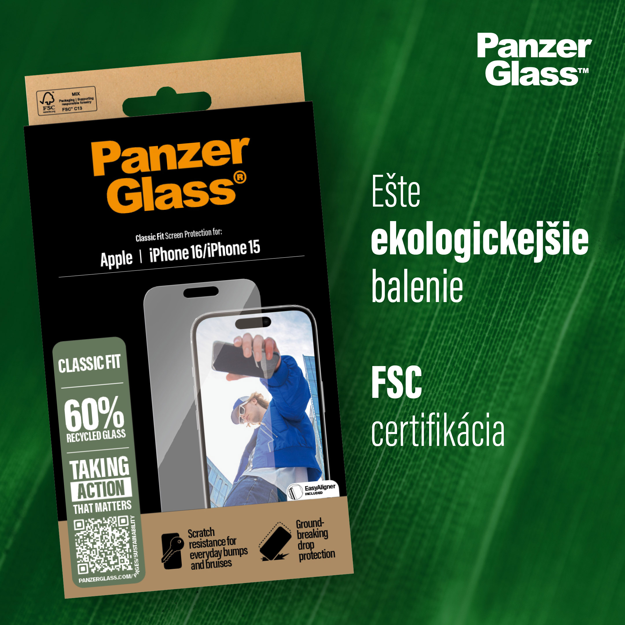 V roku 2024 spoločnosť PanzerGlass™ znížila množstvo papiera používaného na výrobu obalov priemerne o 66 %. A rovnako ako všetky ostatné produkty tohto dánskeho výrobcu, aj sklá pre iPhone 16 Pro sa dodávajú v krabičke vyrobenej z recyklovateľného papiera s certifikátom FSC™.