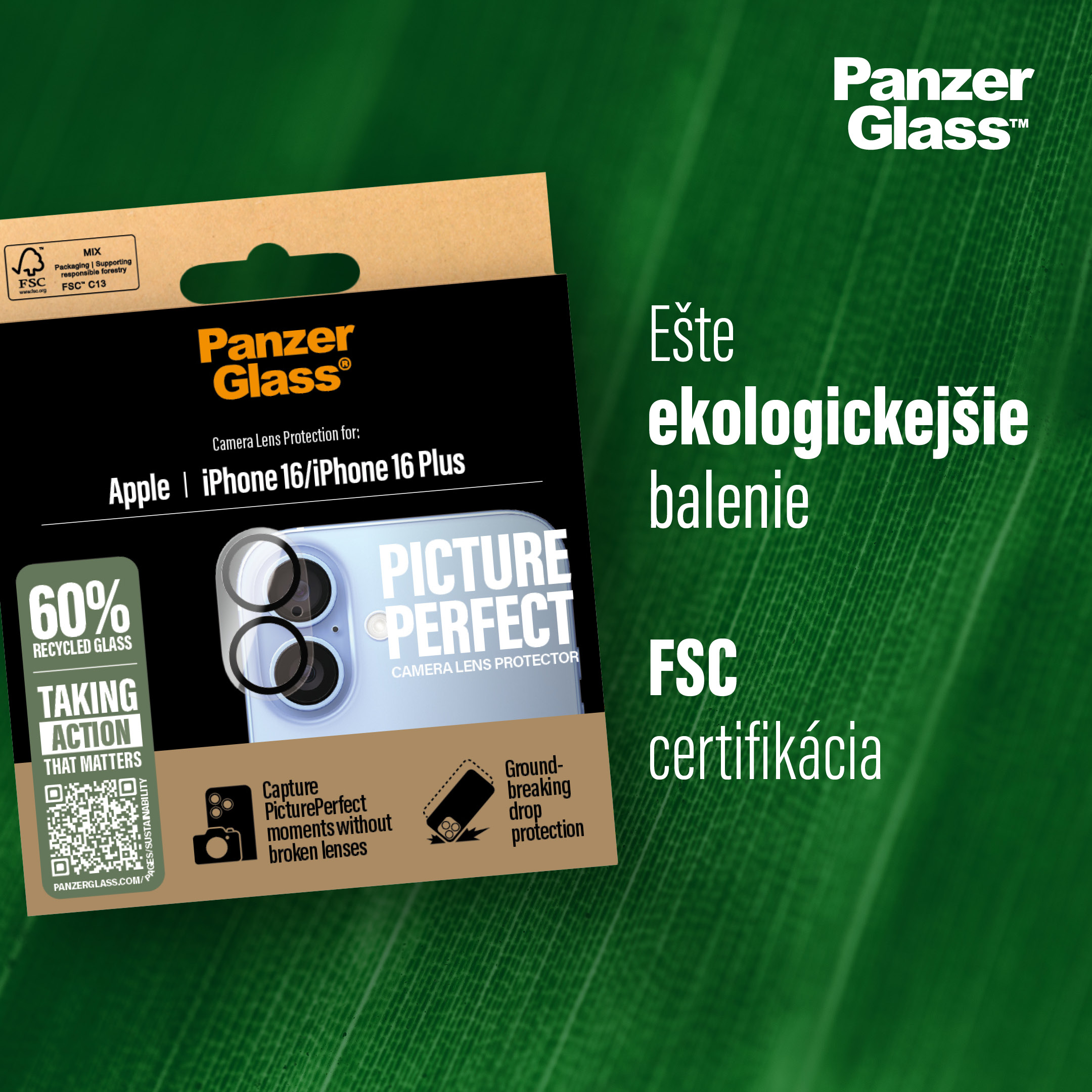 V roku 2024 spoločnosť PanzerGlass™ znížila množstvo papiera používaného na výrobu obalov priemerne o 66 %. A rovnako ako všetky ostatné produkty tohto dánskeho výrobcu, aj ochranné kryty objektívov PicturePerfect pre iPhone 16 sa dodávajú v krabičke vyrobenej z recyklovateľného papiera s certifikátom FSC™.