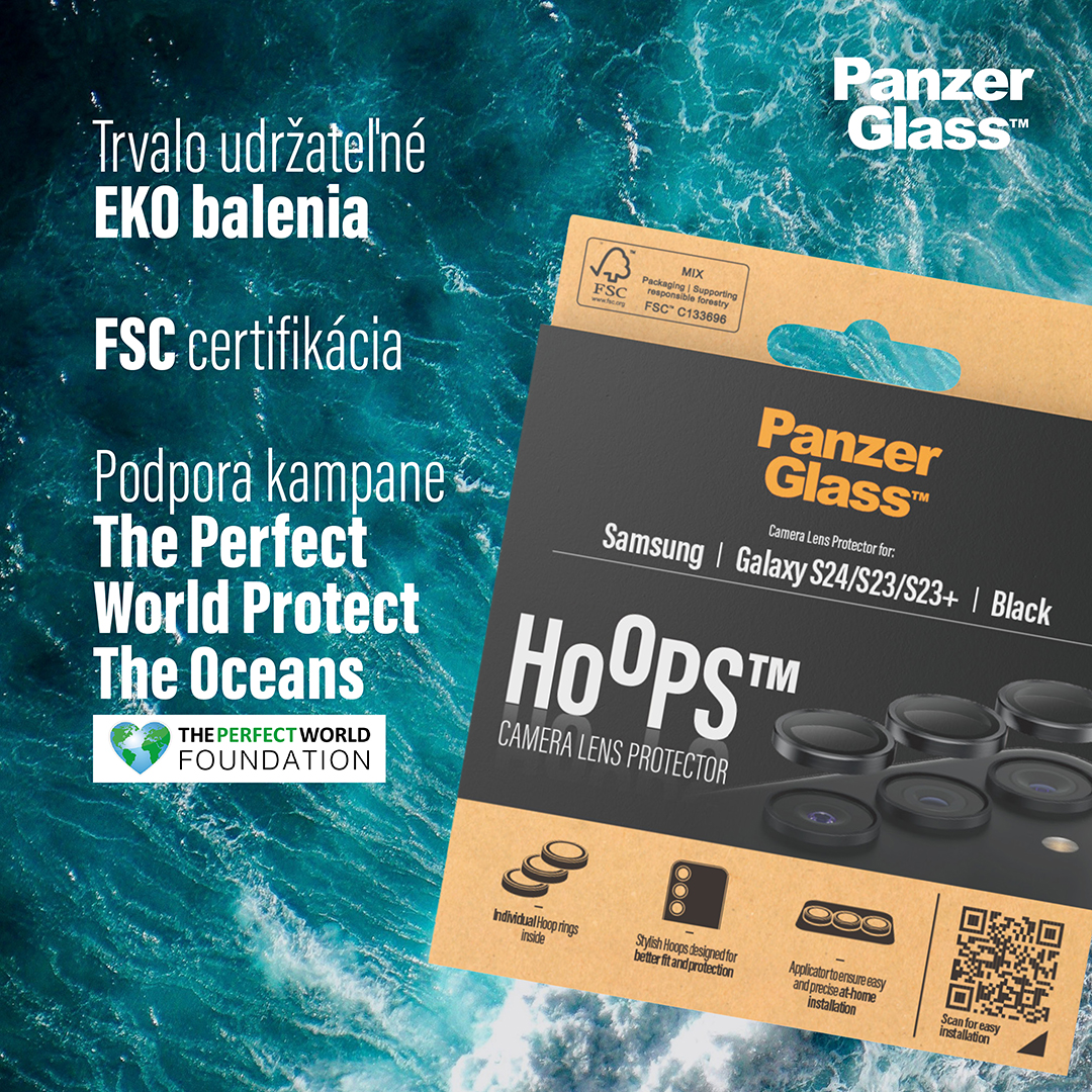 Balenie ochranných krytov objektívov PanzerGlass™ Hoops je vyrobené z ekologického, trvalo udržateľného papiera s FSC certifikáciou. Spoločnosť PanzerGlass™ naviac za každý predaný výrobok prispieva na kampaň The Perfect World Protect The Oceans.