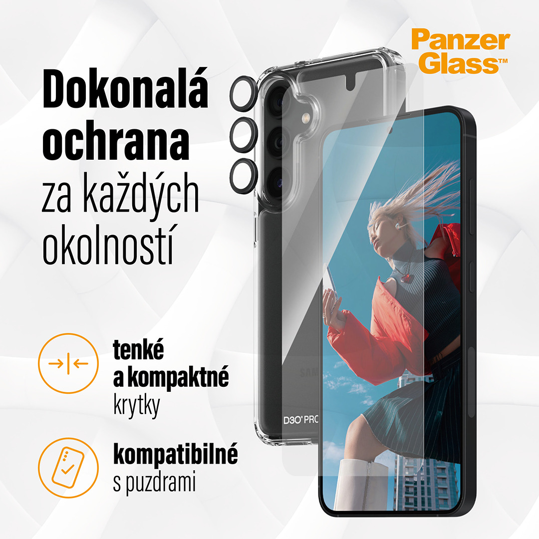 Štýlová ochrana objektívov; Ochráňte objektívy vášho Samsung Galaxy S25+ pred škrabancami a poškodením pri pádoch alebo silných nárazoch . Unikátne ochranné krúžky PanzerGlass™ Hoops sa postarajú o to, že vaše objektívy budú vždy v maximálnom