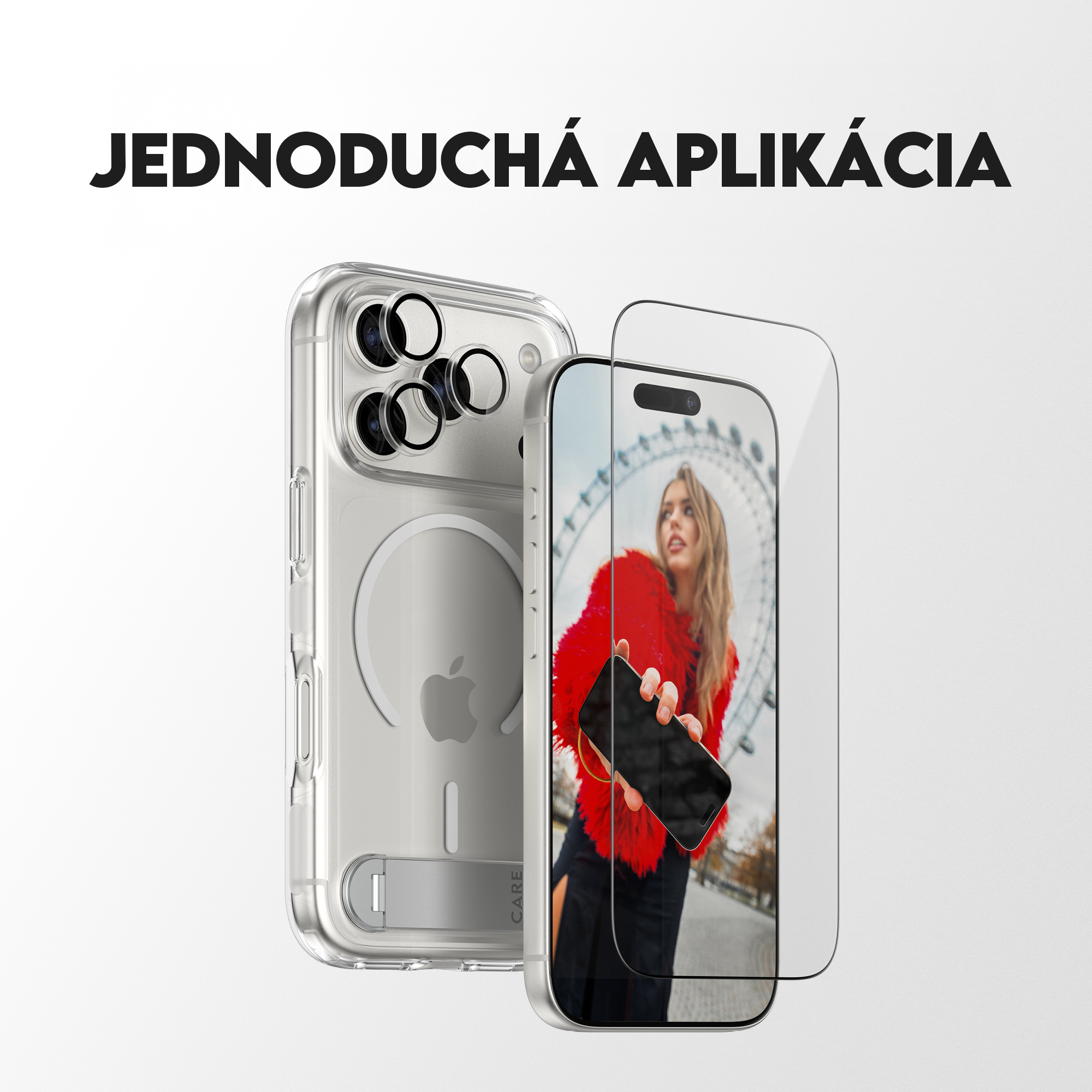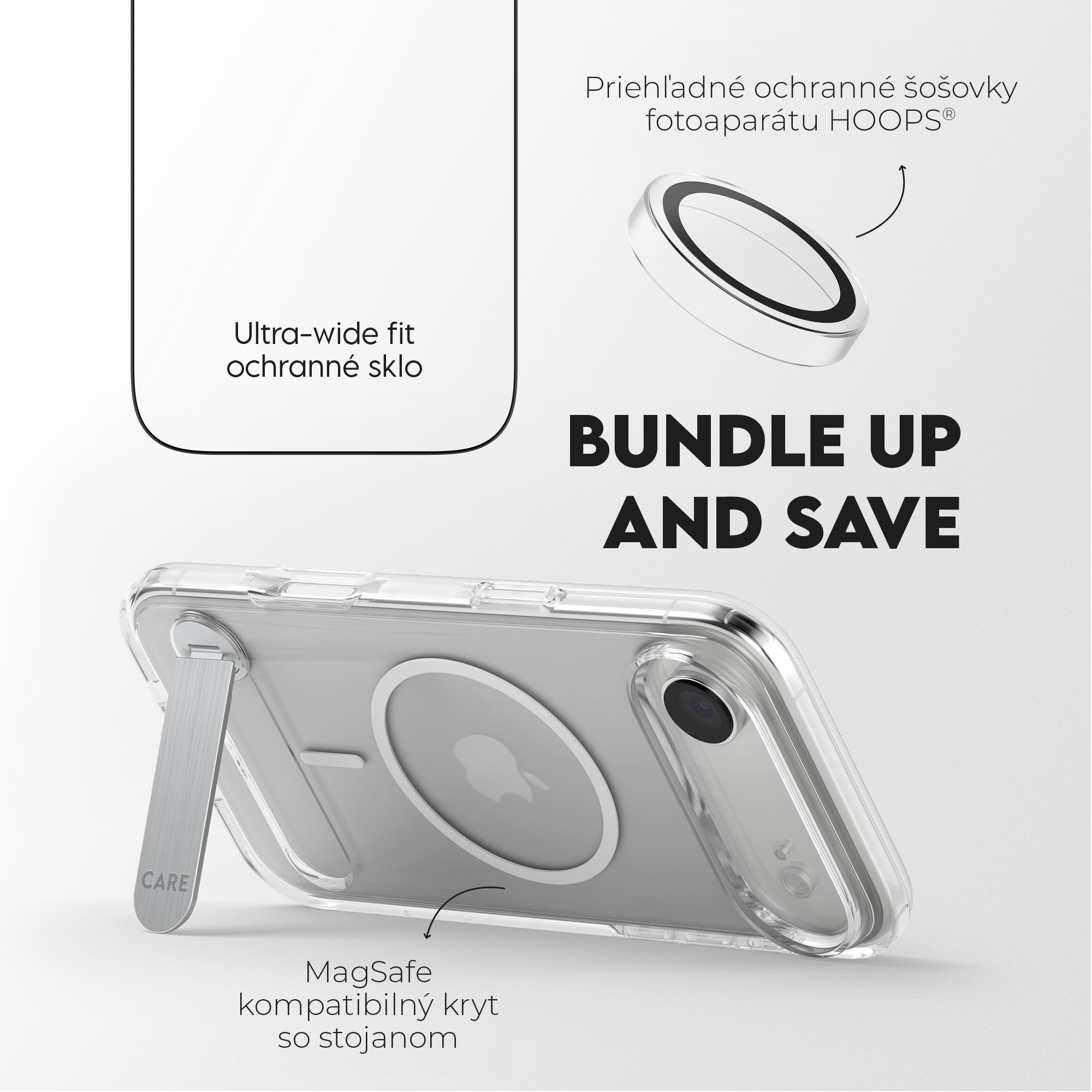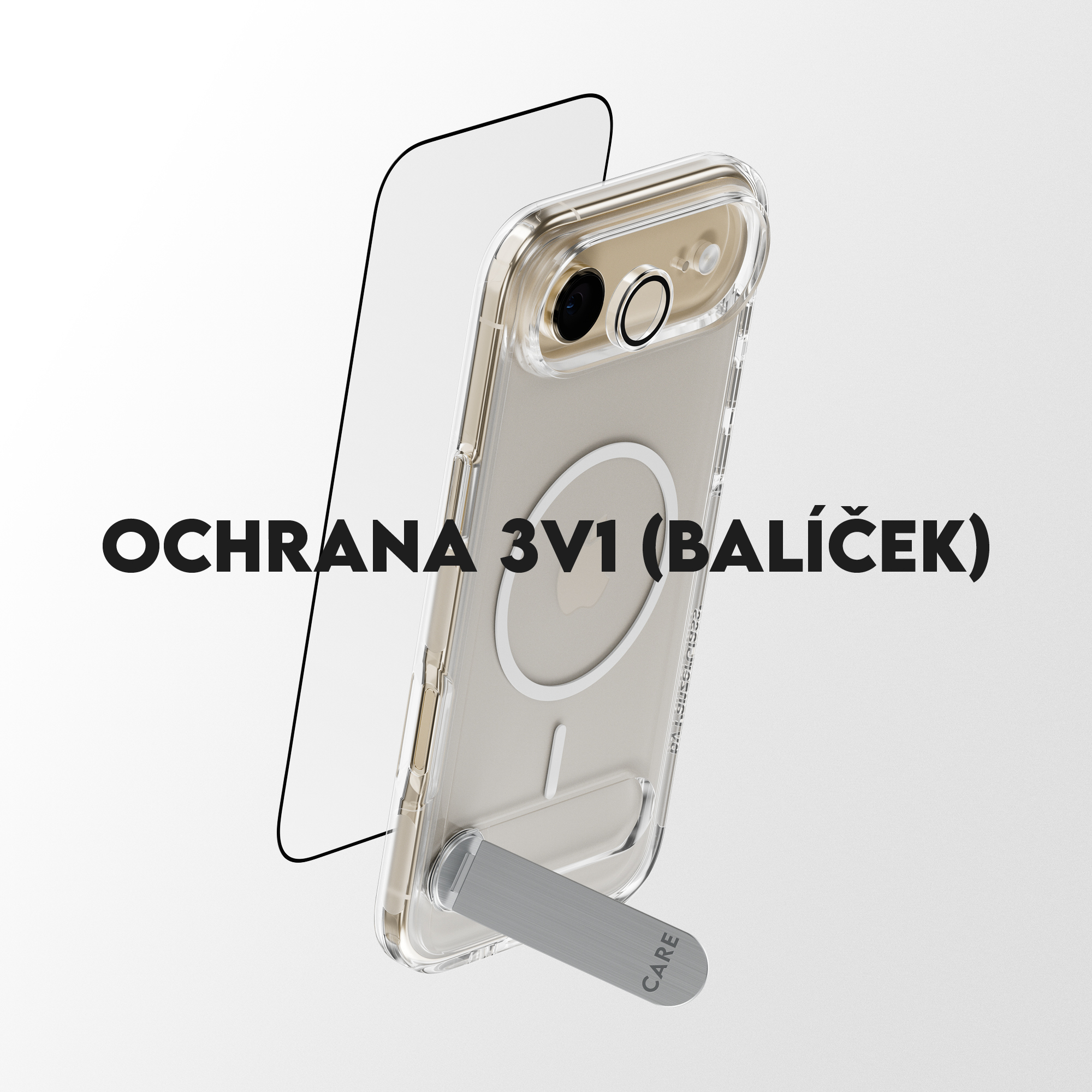 Kompletná ochrana v štýlovom balení: 3 v 1; Set 3 v 1 Kickstand značky PanzerGlass™ prináša kompletnú ochranu vášho smartfónu v elegantnom a udržateľnom prevedení. Set obsahuje odolné ochranné puzdro Kickstand CARE by PanzerGlass™ s podporou MagSafe