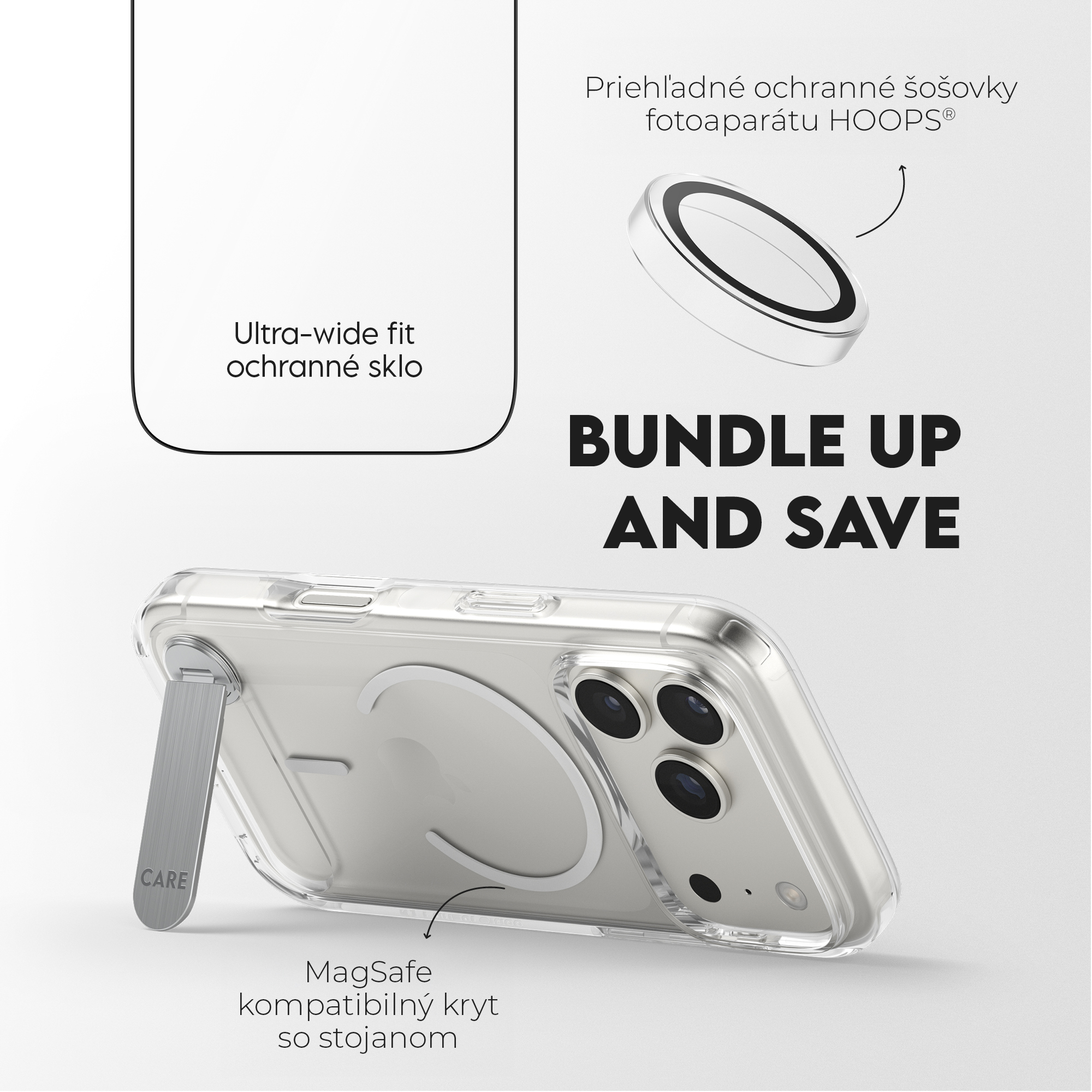 Kompletná ochrana v štýlovom balení: 3 v 1; Set 3 v 1 Kickstand značky PanzerGlass™ prináša kompletnú ochranu vášho smartfónu v elegantnom a udržateľnom prevedení. Set obsahuje odolné ochranné puzdro Kickstand CARE by PanzerGlass™ s podporou MagSafe